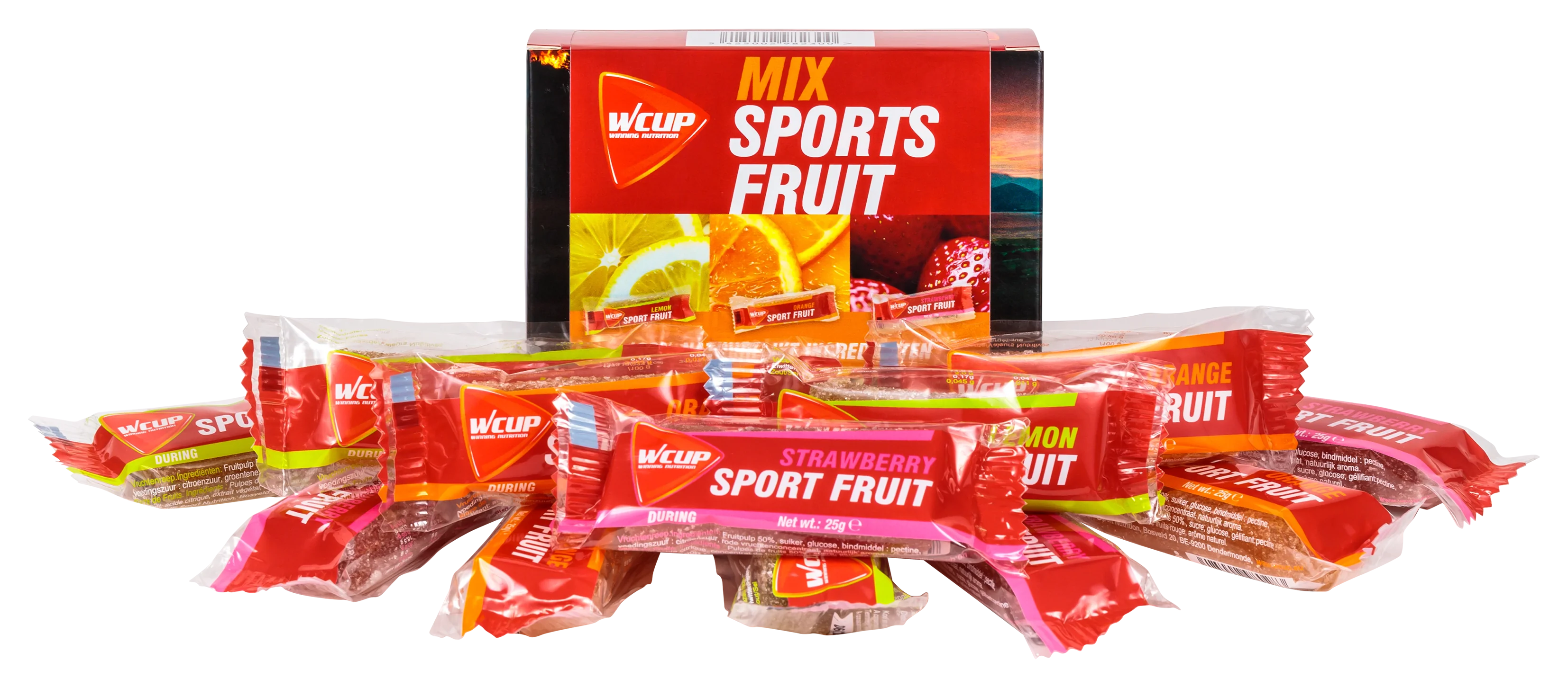 WCUP Sport Fruit est une barre de fruits avec des sucres à absorption rapide produite avec des ingrédients 100 % naturels. Chaque mesure est composée de min. 50 % de fruits et contient 20 grains de glucides dans un ratio optimal glucose-fructose de 2/1.